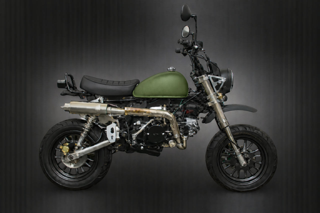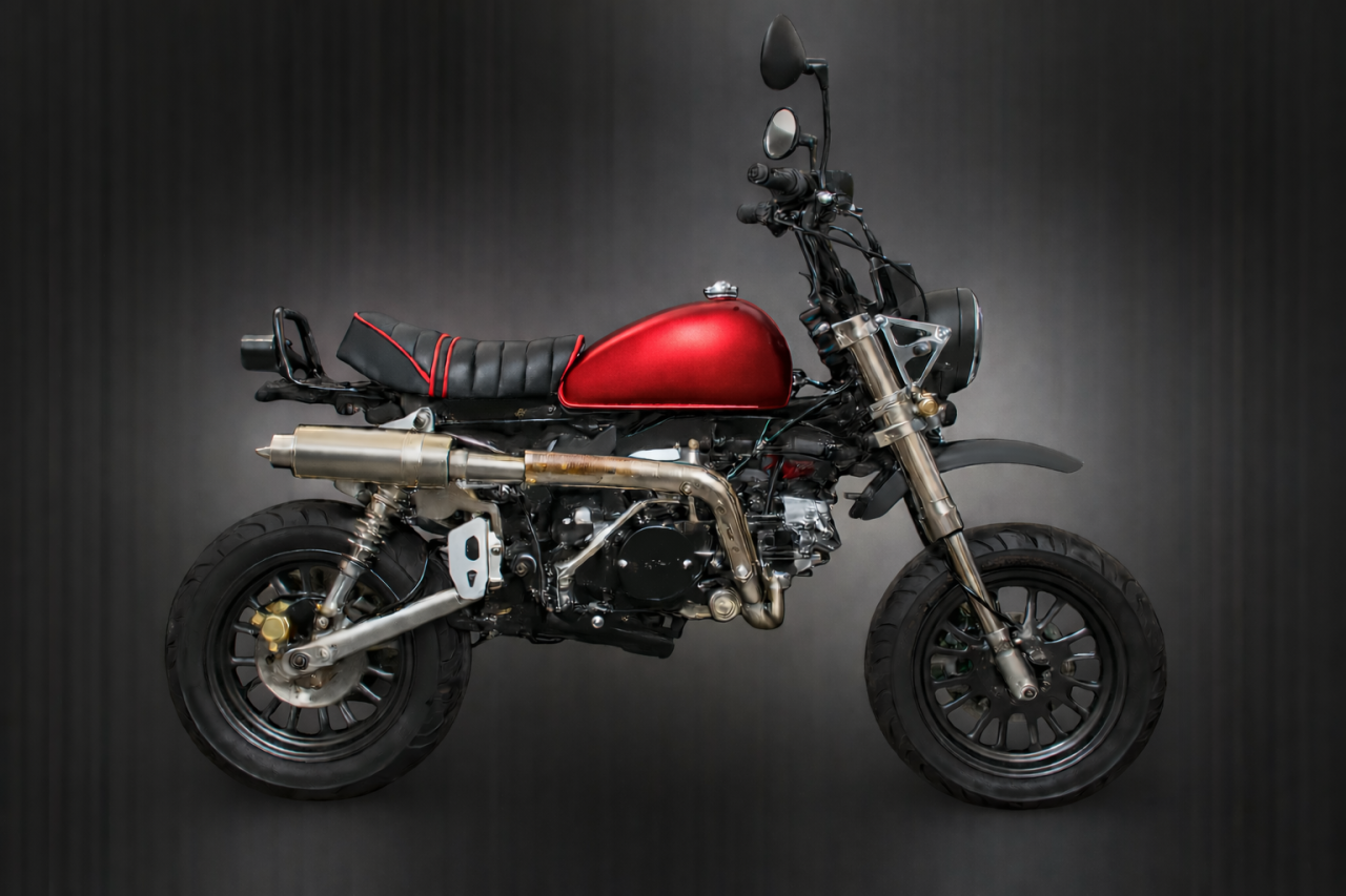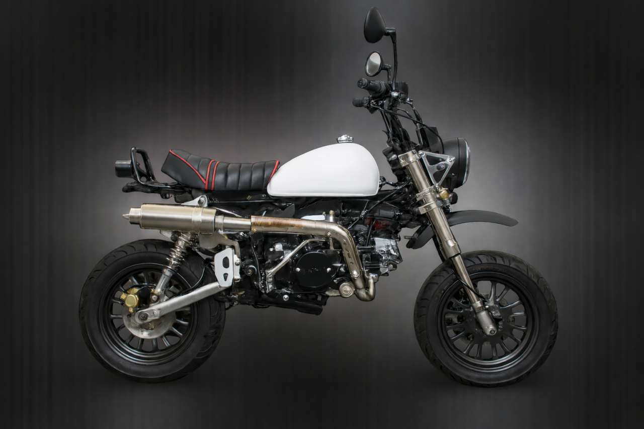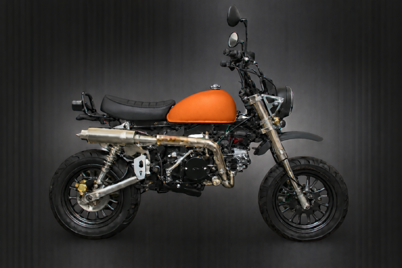 Die neuen Skymini 125 PRO Modelle kommen alle mit der neuen Motor-Einspritzung (niedriger Kraftstoffverbrauch und ein plus an Leistung u. Durchzug & bessere Laufruhe), Up-Side-Down-Vordergabel mit Doppelkolben-bremse & 220mm Bremsscheibe & Stahlflexbremsleitung, ALU-SCHWINGE +10cm, AFAM-GOLD KETTE, NGK ZÜNDKERZENSTECKER, geänderter Übersetzung & Heidenau K61/K58 (zur Wahl) Reifen vo+hi 110/70-12 & 120/70-12 oder Conti Weißwand 1207/70-12" vo+hi; Edelstahl-Rennauspuff mit DB/eater, CNC-ALU Lampenhalter, CNC-ALU Seitenständer, CNC-ALU Fußrasten, CNC-ALU Schalthebel, Ölkühler, CNC-ALU Premium-Spiegel, Gasdruck-Stoßdämpfer
