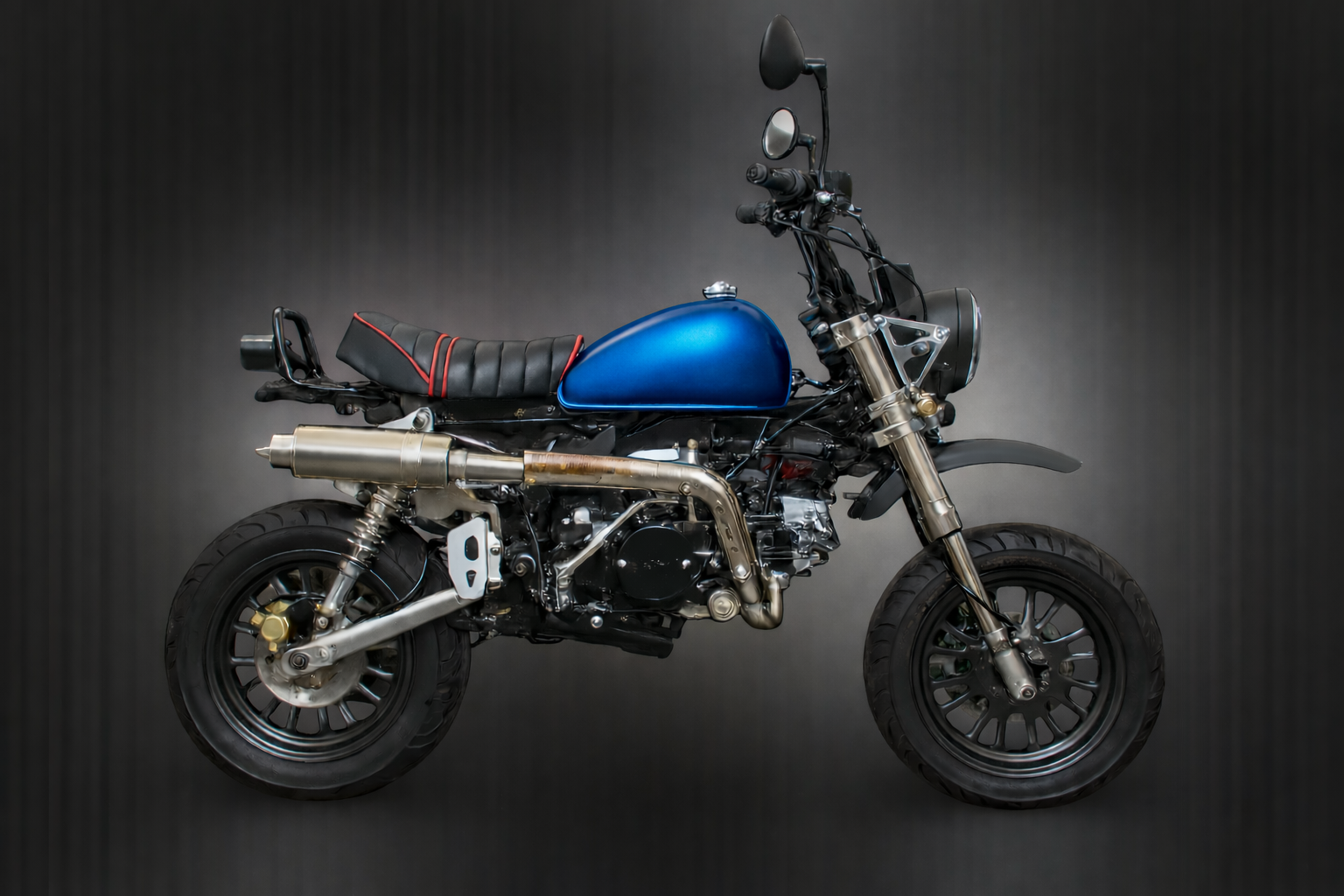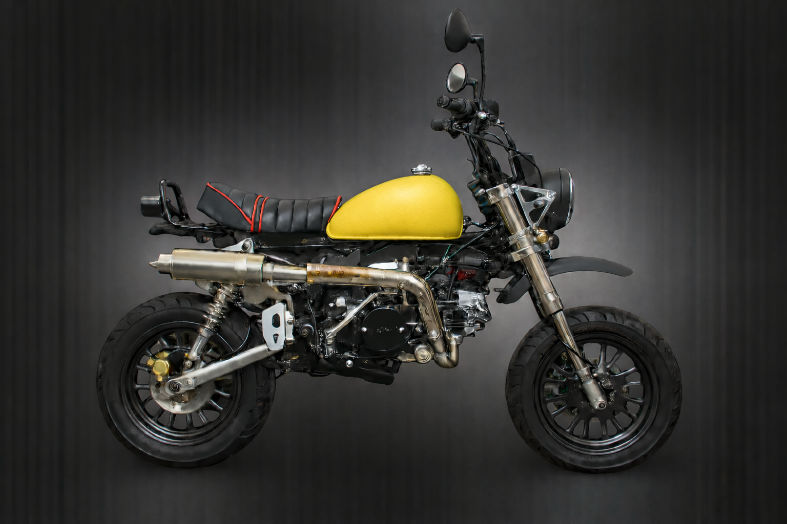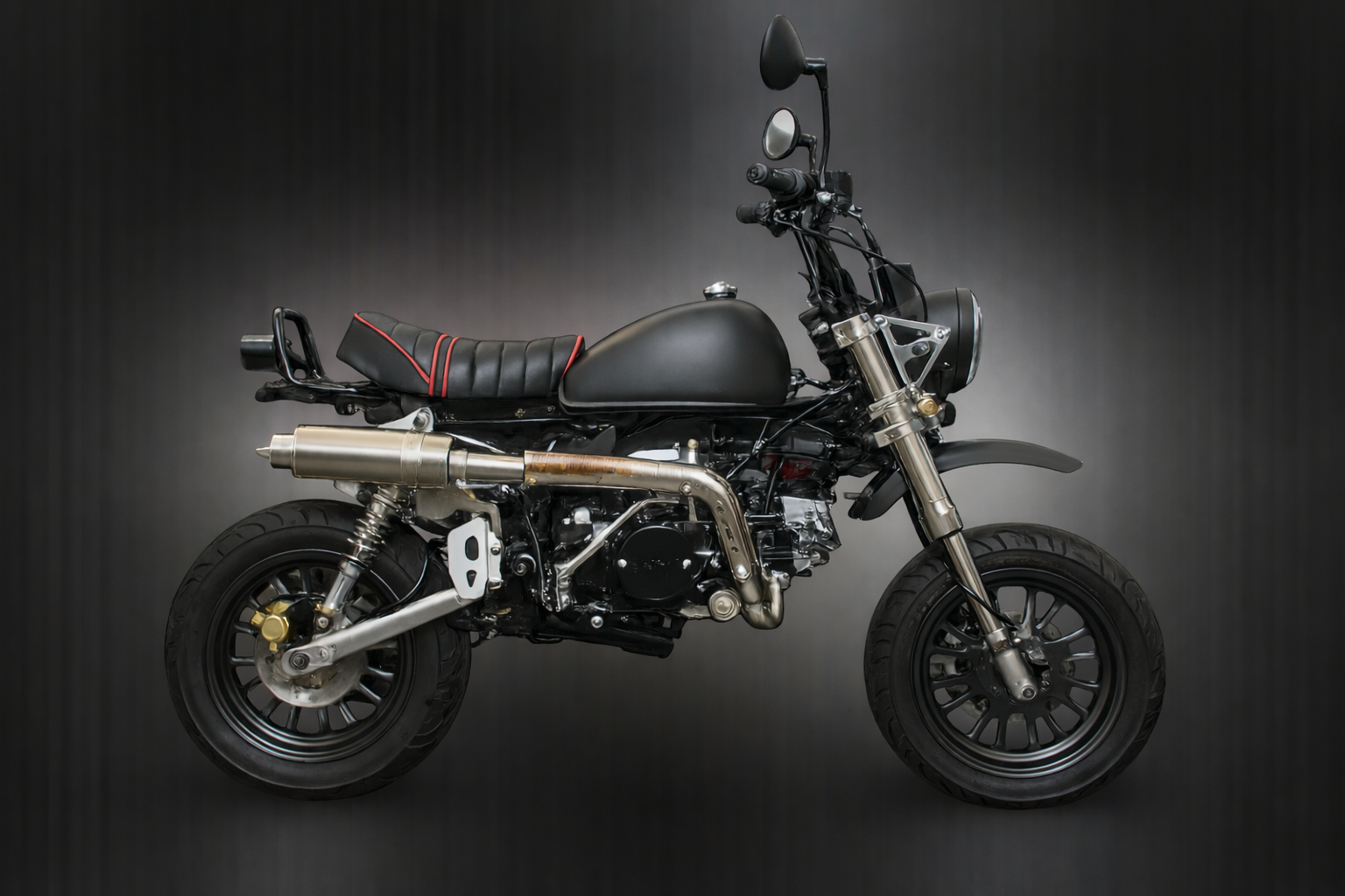 Die neuen Skymini 125 PRO Modelle kommen alle mit der neuen Motor-Einspritzung (niedriger Kraftstoffverbrauch und ein plus an Leistung u. Durchzug & bessere Laufruhe), Up-Side-Down-Vordergabel mit Doppelkolben-bremse & 220mm Bremsscheibe & Stahlflexbremsleitung, ALU-SCHWINGE +10cm, AFAM-GOLD KETTE, NGK ZÜNDKERZENSTECKER, geänderter Übersetzung & Heidenau K61/K58 (zur Wahl) Reifen vo+hi 110/70-12 & 120/70-12 oder Conti Weißwand 1207/70-12" vo+hi; Edelstahl-Rennauspuff mit DB/eater, CNC-ALU Lampenhalter, CNC-ALU Seitenständer, CNC-ALU Fußrasten, CNC-ALU Schalthebel, Ölkühler, CNC-ALU Premium-Spiegel, Gasdruck-Stoßdämpfer